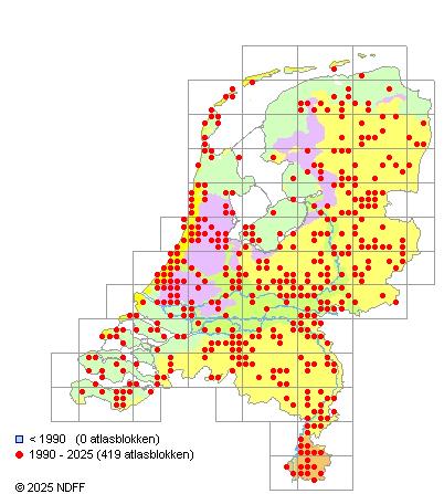 Het aantal atlasblokken (5x5 km) waarin de soort is gemeld binnen een periode van vijf jaar (vanaf 1980) of twintig jaar. Niet gecorrigeerd voor waarnemersinspanning en het aantal doorgegeven waarnemingen kan sterk variëren per periode, dus een trend in verspreiding kan hier niet direct uit worden afgelezen. Het opgegeven jaartal is het eerste jaar van de periode. Bron: gevalideerde waarnemingen uit de NDFF.