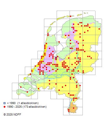 Het aantal atlasblokken (5x5 km) waarin de soort is gemeld binnen een periode van vijf jaar (vanaf 1980) of twintig jaar. Niet gecorrigeerd voor waarnemersinspanning en het aantal doorgegeven waarnemingen kan sterk variëren per periode, dus een trend in verspreiding kan hier niet direct uit worden afgelezen. Het opgegeven jaartal is het eerste jaar van de periode. Bron: gevalideerde waarnemingen uit de NDFF.