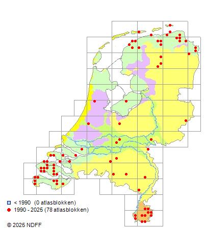 Het aantal atlasblokken (5x5 km) waarin de soort is gemeld binnen een periode van vijf jaar (vanaf 1980) of twintig jaar. Niet gecorrigeerd voor waarnemersinspanning en het aantal doorgegeven waarnemingen kan sterk variëren per periode, dus een trend in verspreiding kan hier niet direct uit worden afgelezen. Het opgegeven jaartal is het eerste jaar van de periode. Bron: gevalideerde waarnemingen uit de NDFF.