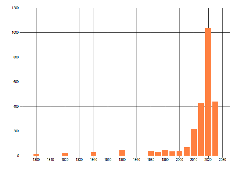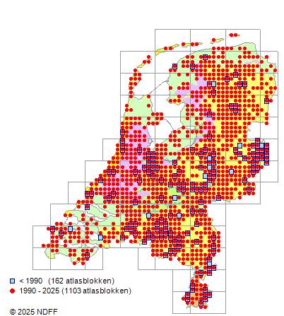 Het aantal atlasblokken (5x5 km) waarin de soort is gemeld binnen een periode van vijf jaar (vanaf 1980) of twintig jaar. Niet gecorrigeerd voor waarnemersinspanning en het aantal doorgegeven waarnemingen kan sterk variëren per periode, dus een trend in verspreiding kan hier niet direct uit worden afgelezen. Het opgegeven jaartal is het eerste jaar van de periode. Bron: gevalideerde waarnemingen uit de NDFF.
