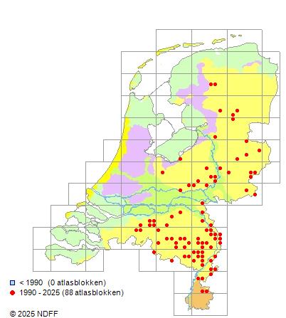 Het aantal atlasblokken (5x5 km) waarin de soort is gemeld binnen een periode van vijf jaar (vanaf 1980) of twintig jaar. Niet gecorrigeerd voor waarnemersinspanning en het aantal doorgegeven waarnemingen kan sterk variëren per periode, dus een trend in verspreiding kan hier niet direct uit worden afgelezen. Het opgegeven jaartal is het eerste jaar van de periode. Bron: gevalideerde waarnemingen uit de NDFF.