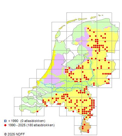 Het aantal atlasblokken (5x5 km) waarin de soort is gemeld binnen een periode van vijf jaar (vanaf 1980) of twintig jaar. Niet gecorrigeerd voor waarnemersinspanning en het aantal doorgegeven waarnemingen kan sterk variëren per periode, dus een trend in verspreiding kan hier niet direct uit worden afgelezen. Het opgegeven jaartal is het eerste jaar van de periode. Bron: gevalideerde waarnemingen uit de NDFF.