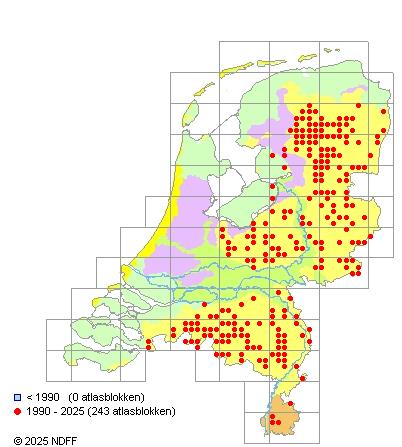 Het aantal atlasblokken (5x5 km) waarin de soort is gemeld binnen een periode van vijf jaar (vanaf 1980) of twintig jaar. Niet gecorrigeerd voor waarnemersinspanning en het aantal doorgegeven waarnemingen kan sterk variëren per periode, dus een trend in verspreiding kan hier niet direct uit worden afgelezen. Het opgegeven jaartal is het eerste jaar van de periode. Bron: gevalideerde waarnemingen uit de NDFF.