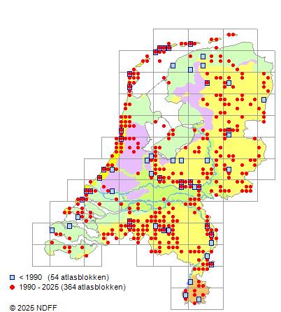 Het aantal atlasblokken (5x5 km) waarin de soort is gemeld binnen een periode van vijf jaar (vanaf 1980) of twintig jaar. Niet gecorrigeerd voor waarnemersinspanning en het aantal doorgegeven waarnemingen kan sterk variëren per periode, dus een trend in verspreiding kan hier niet direct uit worden afgelezen. Het opgegeven jaartal is het eerste jaar van de periode. Bron: gevalideerde waarnemingen uit de NDFF.