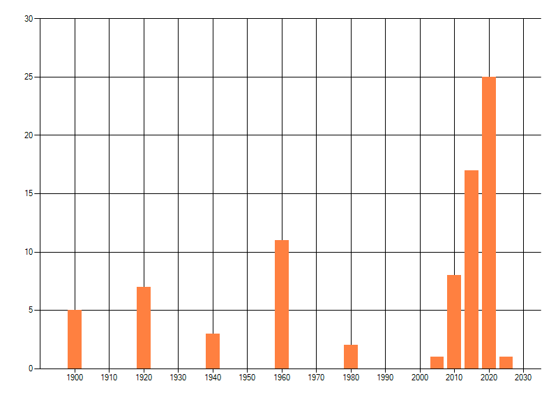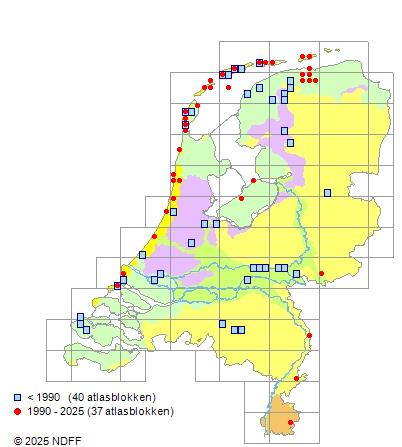 Het aantal atlasblokken (5x5 km) waarin de soort is gemeld binnen een periode van vijf jaar (vanaf 1980) of twintig jaar. Niet gecorrigeerd voor waarnemersinspanning en het aantal doorgegeven waarnemingen kan sterk variëren per periode, dus een trend in verspreiding kan hier niet direct uit worden afgelezen. Het opgegeven jaartal is het eerste jaar van de periode. Bron: gevalideerde waarnemingen uit de NDFF.