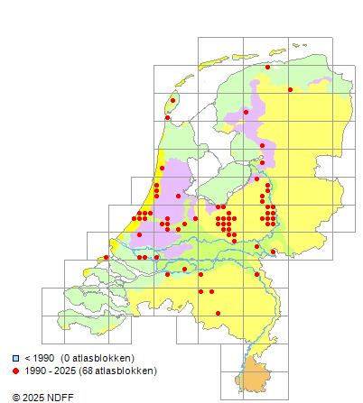 Het aantal atlasblokken (5x5 km) waarin de soort is gemeld binnen een periode van vijf jaar (vanaf 1980) of twintig jaar. Niet gecorrigeerd voor waarnemersinspanning en het aantal doorgegeven waarnemingen kan sterk variëren per periode, dus een trend in verspreiding kan hier niet direct uit worden afgelezen. Het opgegeven jaartal is het eerste jaar van de periode. Bron: gevalideerde waarnemingen uit de NDFF.