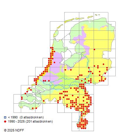 Het aantal atlasblokken (5x5 km) waarin de soort is gemeld binnen een periode van vijf jaar (vanaf 1980) of twintig jaar. Niet gecorrigeerd voor waarnemersinspanning en het aantal doorgegeven waarnemingen kan sterk variëren per periode, dus een trend in verspreiding kan hier niet direct uit worden afgelezen. Het opgegeven jaartal is het eerste jaar van de periode. Bron: gevalideerde waarnemingen uit de NDFF.