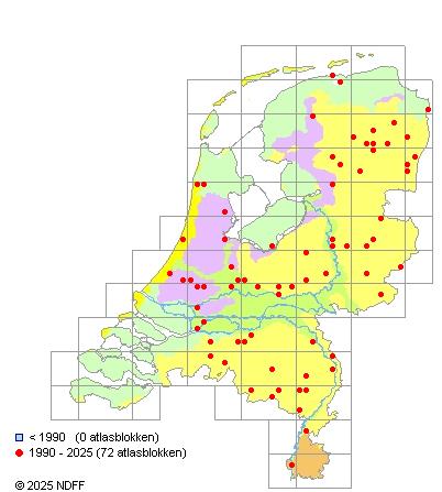 Het aantal atlasblokken (5x5 km) waarin de soort is gemeld binnen een periode van vijf jaar (vanaf 1980) of twintig jaar. Niet gecorrigeerd voor waarnemersinspanning en het aantal doorgegeven waarnemingen kan sterk variëren per periode, dus een trend in verspreiding kan hier niet direct uit worden afgelezen. Het opgegeven jaartal is het eerste jaar van de periode. Bron: gevalideerde waarnemingen uit de NDFF.