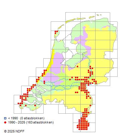 Het aantal atlasblokken (5x5 km) waarin de soort is gemeld binnen een periode van vijf jaar (vanaf 1980) of twintig jaar. Niet gecorrigeerd voor waarnemersinspanning en het aantal doorgegeven waarnemingen kan sterk variëren per periode, dus een trend in verspreiding kan hier niet direct uit worden afgelezen. Het opgegeven jaartal is het eerste jaar van de periode. Bron: gevalideerde waarnemingen uit de NDFF.