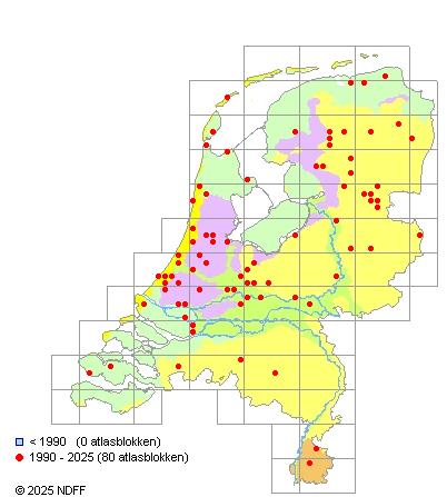 Het aantal atlasblokken (5x5 km) waarin de soort is gemeld binnen een periode van vijf jaar (vanaf 1980) of twintig jaar. Niet gecorrigeerd voor waarnemersinspanning en het aantal doorgegeven waarnemingen kan sterk variëren per periode, dus een trend in verspreiding kan hier niet direct uit worden afgelezen. Het opgegeven jaartal is het eerste jaar van de periode. Bron: gevalideerde waarnemingen uit de NDFF.