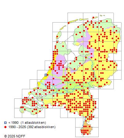 Het aantal atlasblokken (5x5 km) waarin de soort is gemeld binnen een periode van vijf jaar (vanaf 1980) of twintig jaar. Niet gecorrigeerd voor waarnemersinspanning en het aantal doorgegeven waarnemingen kan sterk variëren per periode, dus een trend in verspreiding kan hier niet direct uit worden afgelezen. Het opgegeven jaartal is het eerste jaar van de periode. Bron: gevalideerde waarnemingen uit de NDFF.