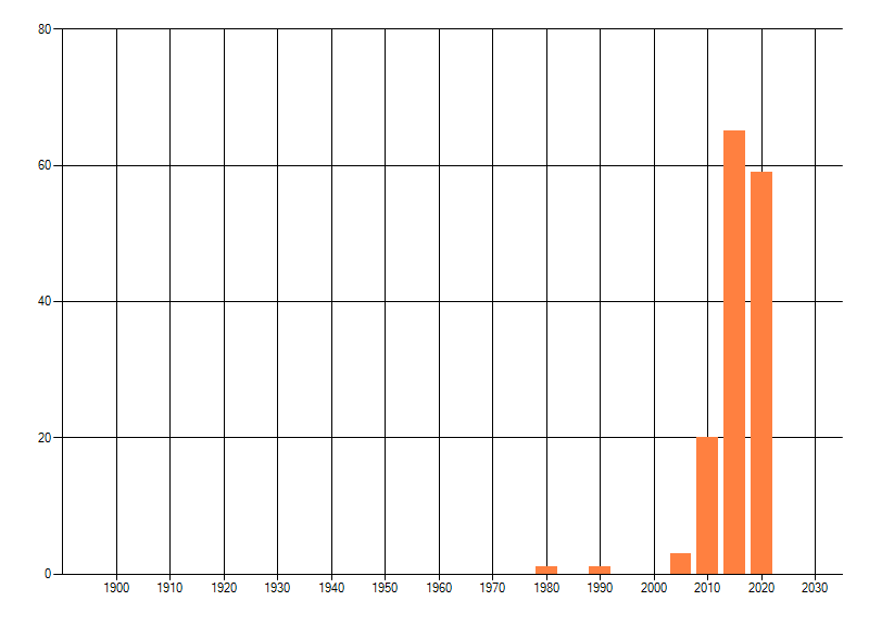 Het aantal atlasblokken (5x5 km) waarin de soort is gemeld binnen een periode van vijf jaar (vanaf 1980) of twintig jaar. Niet gecorrigeerd voor waarnemersinspanning en het aantal doorgegeven waarnemingen kan sterk variëren per periode, dus een trend in verspreiding kan hier niet direct uit worden afgelezen. Het opgegeven jaartal is het eerste jaar van de periode. Bron: gevalideerde waarnemingen uit de NDFF.