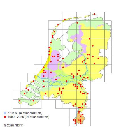 Het aantal atlasblokken (5x5 km) waarin de soort is gemeld binnen een periode van vijf jaar (vanaf 1980) of twintig jaar. Niet gecorrigeerd voor waarnemersinspanning en het aantal doorgegeven waarnemingen kan sterk variëren per periode, dus een trend in verspreiding kan hier niet direct uit worden afgelezen. Het opgegeven jaartal is het eerste jaar van de periode. Bron: gevalideerde waarnemingen uit de NDFF.