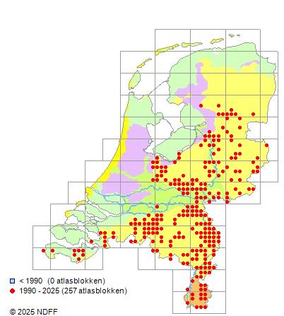 Het aantal atlasblokken (5x5 km) waarin de soort is gemeld binnen een periode van vijf jaar (vanaf 1980) of twintig jaar. Niet gecorrigeerd voor waarnemersinspanning en het aantal doorgegeven waarnemingen kan sterk variëren per periode, dus een trend in verspreiding kan hier niet direct uit worden afgelezen. Het opgegeven jaartal is het eerste jaar van de periode. Bron: gevalideerde waarnemingen uit de NDFF.