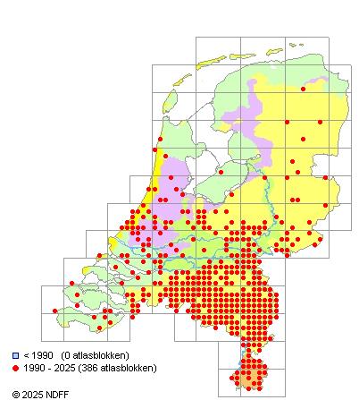 Het aantal atlasblokken (5x5 km) waarin de soort is gemeld binnen een periode van vijf jaar (vanaf 1980) of twintig jaar. Niet gecorrigeerd voor waarnemersinspanning en het aantal doorgegeven waarnemingen kan sterk variëren per periode, dus een trend in verspreiding kan hier niet direct uit worden afgelezen. Het opgegeven jaartal is het eerste jaar van de periode. Bron: gevalideerde waarnemingen uit de NDFF.