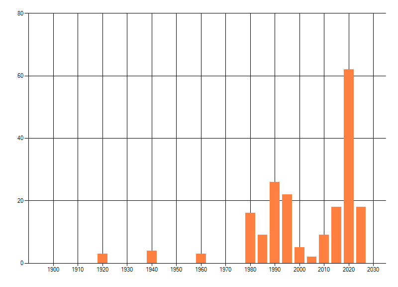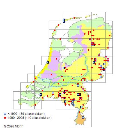 Het aantal atlasblokken (5x5 km) waarin de soort is gemeld binnen een periode van vijf jaar (vanaf 1980) of twintig jaar. Niet gecorrigeerd voor waarnemersinspanning en het aantal doorgegeven waarnemingen kan sterk variëren per periode, dus een trend in verspreiding kan hier niet direct uit worden afgelezen. Het opgegeven jaartal is het eerste jaar van de periode. Bron: gevalideerde waarnemingen uit de NDFF.
