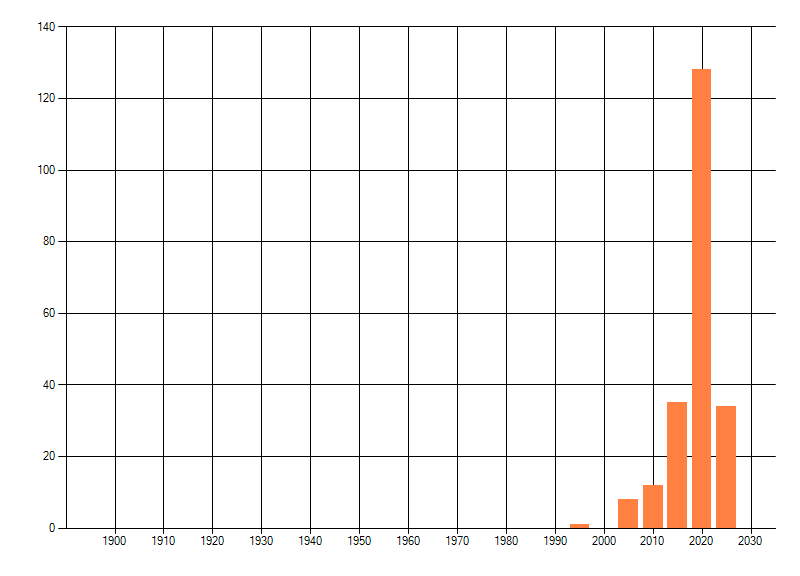 Het aantal atlasblokken (5x5 km) waarin de soort is gemeld binnen een periode van vijf jaar (vanaf 1980) of twintig jaar. Niet gecorrigeerd voor waarnemersinspanning en het aantal doorgegeven waarnemingen kan sterk variëren per periode, dus een trend in verspreiding kan hier niet direct uit worden afgelezen. Het opgegeven jaartal is het eerste jaar van de periode. Bron: gevalideerde waarnemingen uit de NDFF.