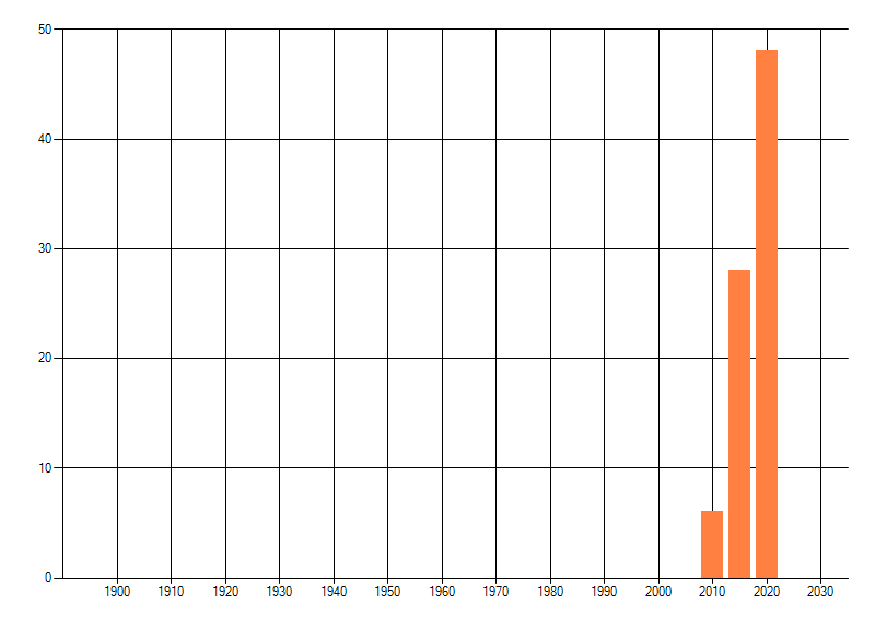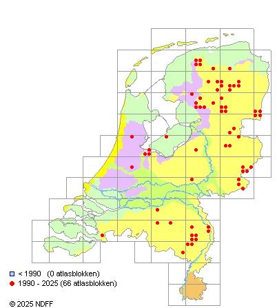 Het aantal atlasblokken (5x5 km) waarin de soort is gemeld binnen een periode van vijf jaar (vanaf 1980) of twintig jaar. Niet gecorrigeerd voor waarnemersinspanning en het aantal doorgegeven waarnemingen kan sterk variëren per periode, dus een trend in verspreiding kan hier niet direct uit worden afgelezen. Het opgegeven jaartal is het eerste jaar van de periode. Bron: gevalideerde waarnemingen uit de NDFF.