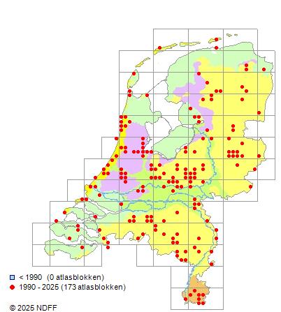 Het aantal atlasblokken (5x5 km) waarin de soort is gemeld binnen een periode van vijf jaar (vanaf 1980) of twintig jaar. Niet gecorrigeerd voor waarnemersinspanning en het aantal doorgegeven waarnemingen kan sterk variëren per periode, dus een trend in verspreiding kan hier niet direct uit worden afgelezen. Het opgegeven jaartal is het eerste jaar van de periode. Bron: gevalideerde waarnemingen uit de NDFF.