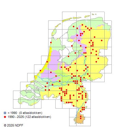 Het aantal atlasblokken (5x5 km) waarin de soort is gemeld binnen een periode van vijf jaar (vanaf 1980) of twintig jaar. Niet gecorrigeerd voor waarnemersinspanning en het aantal doorgegeven waarnemingen kan sterk variëren per periode, dus een trend in verspreiding kan hier niet direct uit worden afgelezen. Het opgegeven jaartal is het eerste jaar van de periode. Bron: gevalideerde waarnemingen uit de NDFF.
