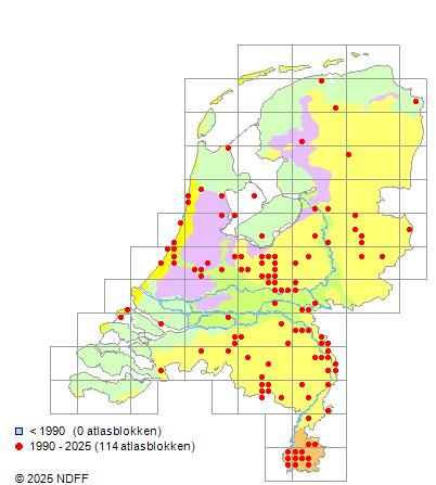 Het aantal atlasblokken (5x5 km) waarin de soort is gemeld binnen een periode van vijf jaar (vanaf 1980) of twintig jaar. Niet gecorrigeerd voor waarnemersinspanning en het aantal doorgegeven waarnemingen kan sterk variëren per periode, dus een trend in verspreiding kan hier niet direct uit worden afgelezen. Het opgegeven jaartal is het eerste jaar van de periode. Bron: gevalideerde waarnemingen uit de NDFF.