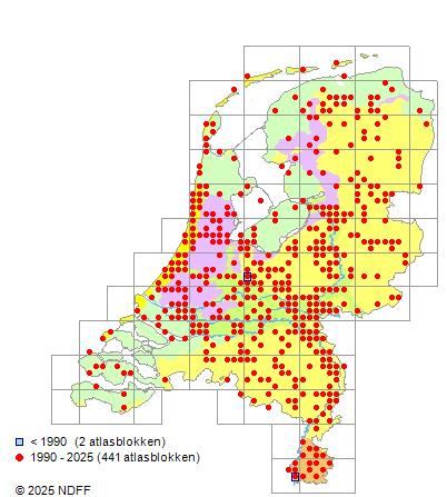Het aantal atlasblokken (5x5 km) waarin de soort is gemeld binnen een periode van vijf jaar (vanaf 1980) of twintig jaar. Niet gecorrigeerd voor waarnemersinspanning en het aantal doorgegeven waarnemingen kan sterk variëren per periode, dus een trend in verspreiding kan hier niet direct uit worden afgelezen. Het opgegeven jaartal is het eerste jaar van de periode. Bron: gevalideerde waarnemingen uit de NDFF.