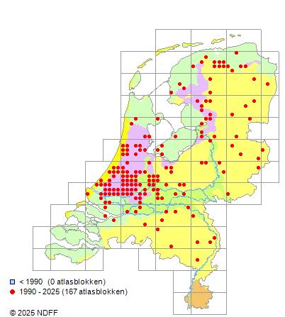 Het aantal atlasblokken (5x5 km) waarin de soort is gemeld binnen een periode van vijf jaar (vanaf 1980) of twintig jaar. Niet gecorrigeerd voor waarnemersinspanning en het aantal doorgegeven waarnemingen kan sterk variëren per periode, dus een trend in verspreiding kan hier niet direct uit worden afgelezen. Het opgegeven jaartal is het eerste jaar van de periode. Bron: gevalideerde waarnemingen uit de NDFF.