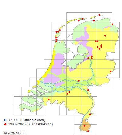 Het aantal atlasblokken (5x5 km) waarin de soort is gemeld binnen een periode van vijf jaar (vanaf 1980) of twintig jaar. Niet gecorrigeerd voor waarnemersinspanning en het aantal doorgegeven waarnemingen kan sterk variëren per periode, dus een trend in verspreiding kan hier niet direct uit worden afgelezen. Het opgegeven jaartal is het eerste jaar van de periode. Bron: gevalideerde waarnemingen uit de NDFF.