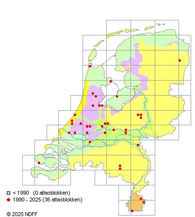 Het aantal atlasblokken (5x5 km) waarin de soort is gemeld binnen een periode van vijf jaar (vanaf 1980) of twintig jaar. Niet gecorrigeerd voor waarnemersinspanning en het aantal doorgegeven waarnemingen kan sterk variëren per periode, dus een trend in verspreiding kan hier niet direct uit worden afgelezen. Het opgegeven jaartal is het eerste jaar van de periode. Bron: gevalideerde waarnemingen uit de NDFF.