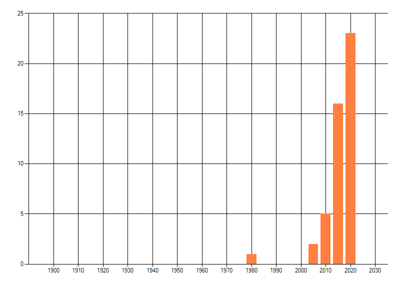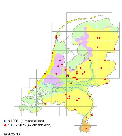 Het aantal atlasblokken (5x5 km) waarin de soort is gemeld binnen een periode van vijf jaar (vanaf 1980) of twintig jaar. Niet gecorrigeerd voor waarnemersinspanning en het aantal doorgegeven waarnemingen kan sterk variëren per periode, dus een trend in verspreiding kan hier niet direct uit worden afgelezen. Het opgegeven jaartal is het eerste jaar van de periode. Bron: gevalideerde waarnemingen uit de NDFF.