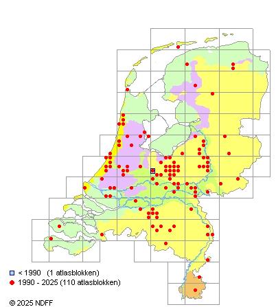 Het aantal atlasblokken (5x5 km) waarin de soort is gemeld binnen een periode van vijf jaar (vanaf 1980) of twintig jaar. Niet gecorrigeerd voor waarnemersinspanning en het aantal doorgegeven waarnemingen kan sterk variëren per periode, dus een trend in verspreiding kan hier niet direct uit worden afgelezen. Het opgegeven jaartal is het eerste jaar van de periode. Bron: gevalideerde waarnemingen uit de NDFF.