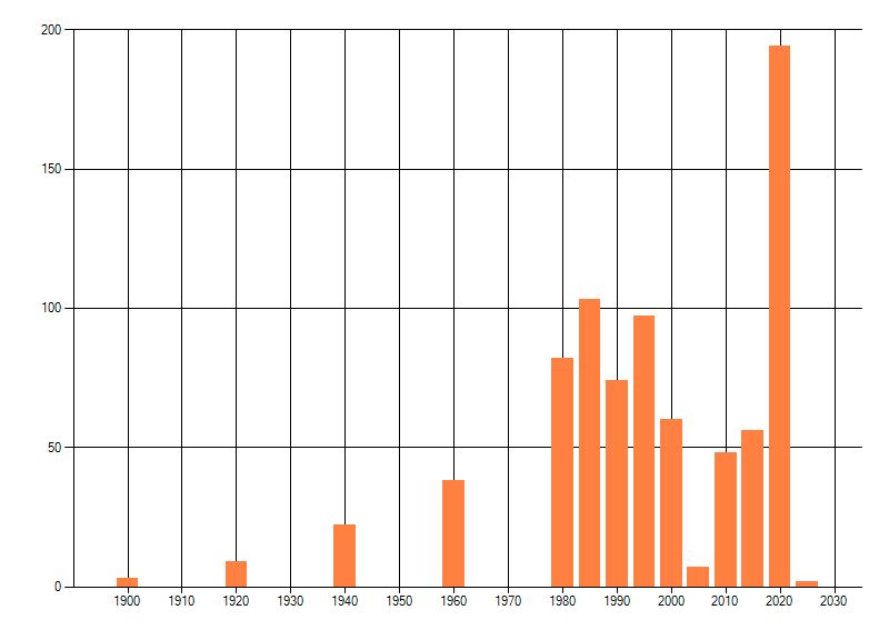 Het aantal atlasblokken (5x5 km) waarin de soort is gemeld binnen een periode van vijf jaar (vanaf 1980) of twintig jaar. Niet gecorrigeerd voor waarnemersinspanning en het aantal doorgegeven waarnemingen kan sterk variëren per periode, dus een trend in verspreiding kan hier niet direct uit worden afgelezen. Het opgegeven jaartal is het eerste jaar van de periode. Bron: gevalideerde waarnemingen uit de NDFF.