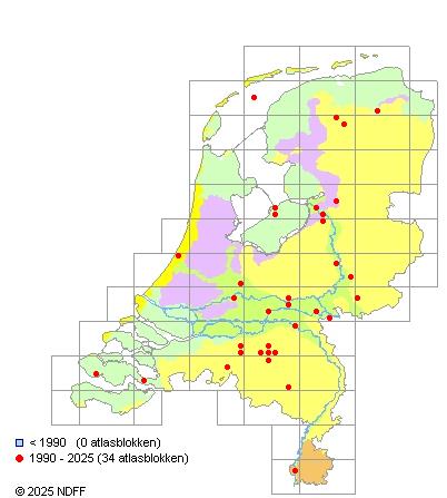 Het aantal atlasblokken (5x5 km) waarin de soort is gemeld binnen een periode van vijf jaar (vanaf 1980) of twintig jaar. Niet gecorrigeerd voor waarnemersinspanning en het aantal doorgegeven waarnemingen kan sterk variëren per periode, dus een trend in verspreiding kan hier niet direct uit worden afgelezen. Het opgegeven jaartal is het eerste jaar van de periode. Bron: gevalideerde waarnemingen uit de NDFF.