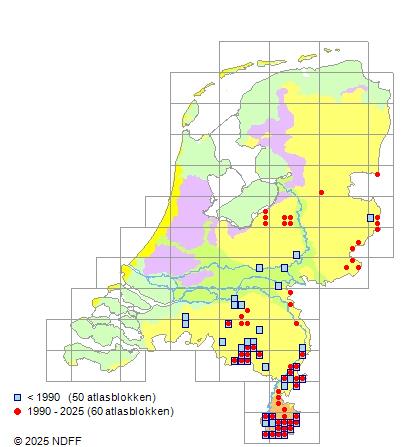 Het aantal atlasblokken (5x5 km) waarin de soort is gemeld binnen een periode van vijf jaar (vanaf 1980) of twintig jaar. Niet gecorrigeerd voor waarnemersinspanning en het aantal doorgegeven waarnemingen kan sterk variëren per periode, dus een trend in verspreiding kan hier niet direct uit worden afgelezen. Het opgegeven jaartal is het eerste jaar van de periode. Bron: gevalideerde waarnemingen uit de NDFF.