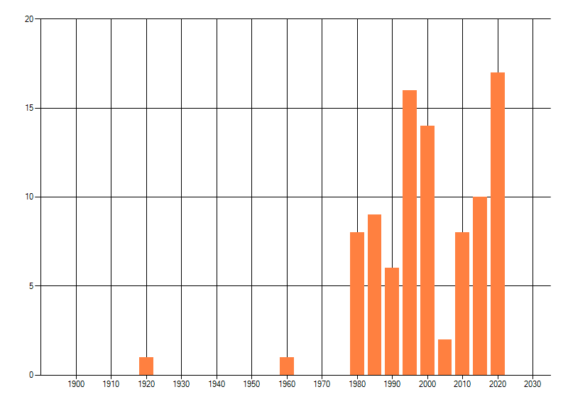Het aantal atlasblokken (5x5 km) waarin de soort is gemeld binnen een periode van vijf jaar (vanaf 1980) of twintig jaar. Niet gecorrigeerd voor waarnemersinspanning en het aantal doorgegeven waarnemingen kan sterk variëren per periode, dus een trend in verspreiding kan hier niet direct uit worden afgelezen. Het opgegeven jaartal is het eerste jaar van de periode. Bron: gevalideerde waarnemingen uit de NDFF.