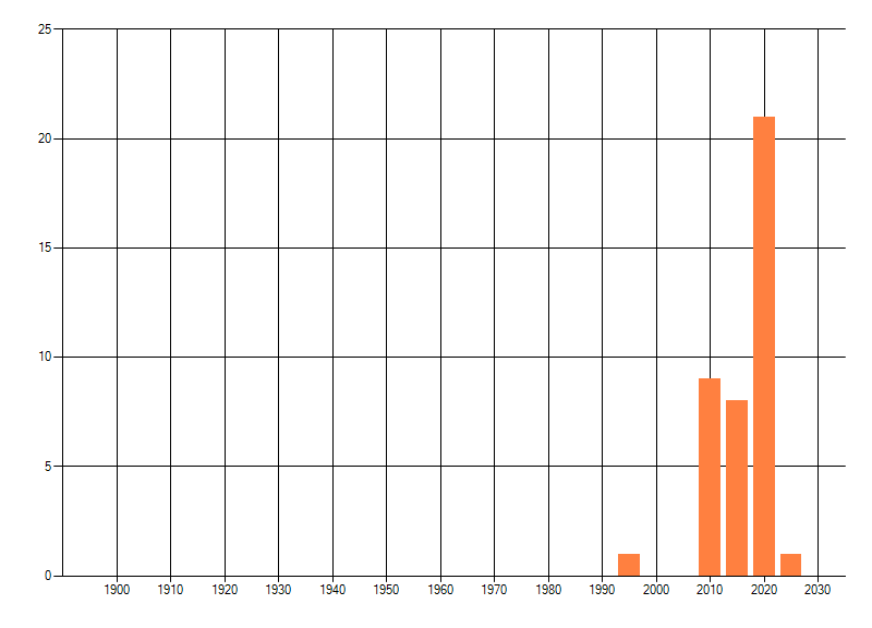 Het aantal atlasblokken (5x5 km) waarin de soort is gemeld binnen een periode van vijf jaar (vanaf 1980) of twintig jaar. Niet gecorrigeerd voor waarnemersinspanning en het aantal doorgegeven waarnemingen kan sterk variëren per periode, dus een trend in verspreiding kan hier niet direct uit worden afgelezen. Het opgegeven jaartal is het eerste jaar van de periode. Bron: gevalideerde waarnemingen uit de NDFF.