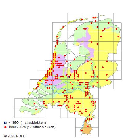 Het aantal atlasblokken (5x5 km) waarin de soort is gemeld binnen een periode van vijf jaar (vanaf 1980) of twintig jaar. Niet gecorrigeerd voor waarnemersinspanning en het aantal doorgegeven waarnemingen kan sterk variëren per periode, dus een trend in verspreiding kan hier niet direct uit worden afgelezen. Het opgegeven jaartal is het eerste jaar van de periode. Bron: gevalideerde waarnemingen uit de NDFF.