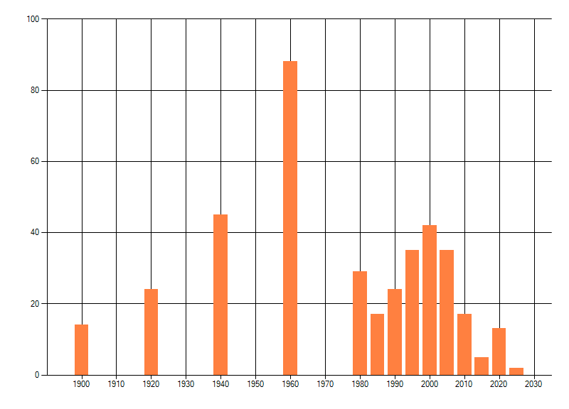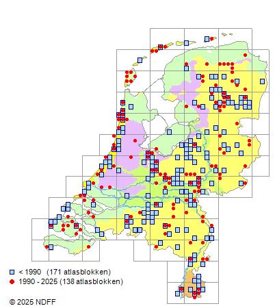 Het aantal atlasblokken (5x5 km) waarin de soort is gemeld binnen een periode van vijf jaar (vanaf 1980) of twintig jaar. Niet gecorrigeerd voor waarnemersinspanning en het aantal doorgegeven waarnemingen kan sterk variëren per periode, dus een trend in verspreiding kan hier niet direct uit worden afgelezen. Het opgegeven jaartal is het eerste jaar van de periode. Bron: gevalideerde waarnemingen uit de NDFF.