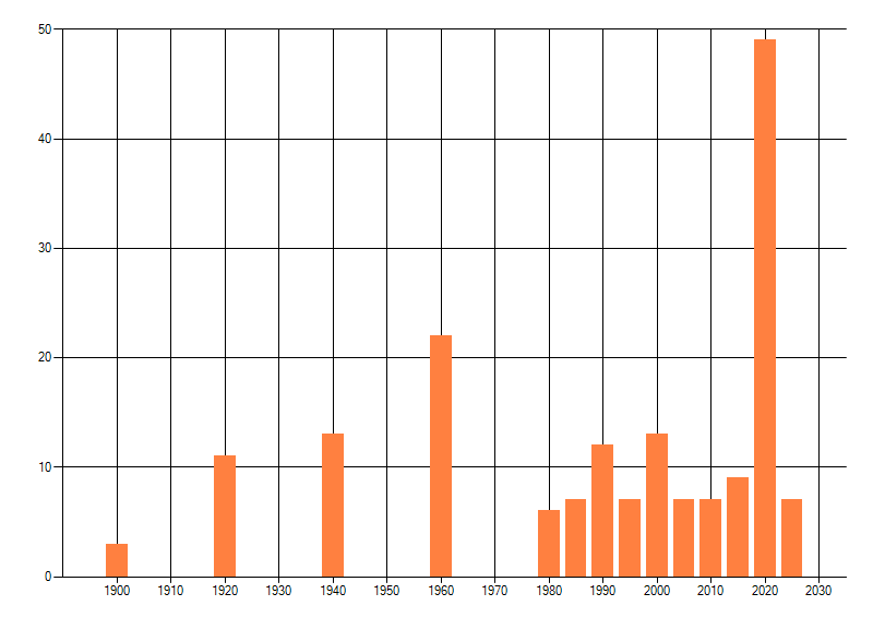 Het aantal atlasblokken (5x5 km) waarin de soort is gemeld binnen een periode van vijf jaar (vanaf 1980) of twintig jaar. Niet gecorrigeerd voor waarnemersinspanning en het aantal doorgegeven waarnemingen kan sterk variëren per periode, dus een trend in verspreiding kan hier niet direct uit worden afgelezen. Het opgegeven jaartal is het eerste jaar van de periode. Bron: gevalideerde waarnemingen uit de NDFF.
