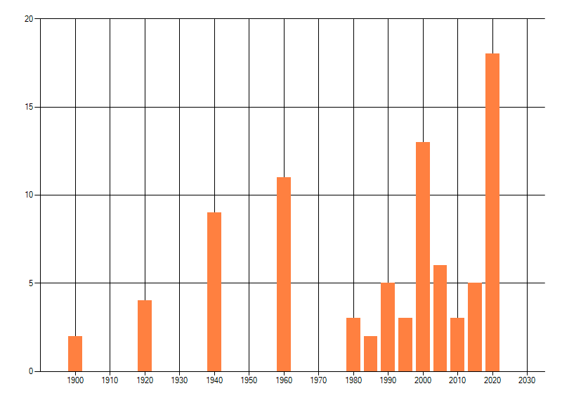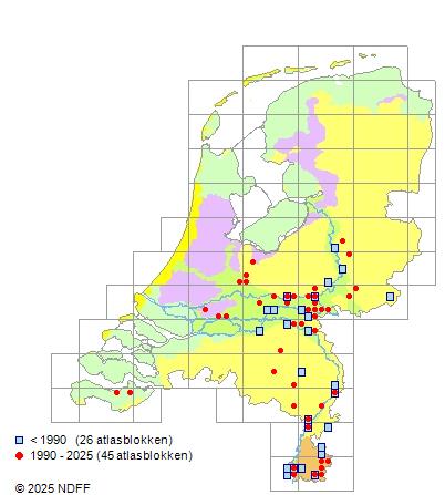 Het aantal atlasblokken (5x5 km) waarin de soort is gemeld binnen een periode van vijf jaar (vanaf 1980) of twintig jaar. Niet gecorrigeerd voor waarnemersinspanning en het aantal doorgegeven waarnemingen kan sterk variëren per periode, dus een trend in verspreiding kan hier niet direct uit worden afgelezen. Het opgegeven jaartal is het eerste jaar van de periode. Bron: gevalideerde waarnemingen uit de NDFF.