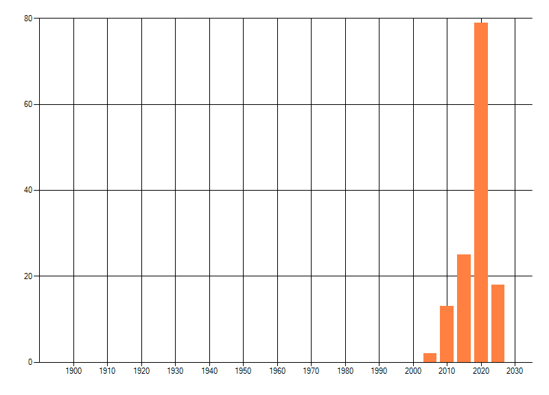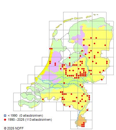 Het aantal atlasblokken (5x5 km) waarin de soort is gemeld binnen een periode van vijf jaar (vanaf 1980) of twintig jaar. Niet gecorrigeerd voor waarnemersinspanning en het aantal doorgegeven waarnemingen kan sterk variëren per periode, dus een trend in verspreiding kan hier niet direct uit worden afgelezen. Het opgegeven jaartal is het eerste jaar van de periode. Bron: gevalideerde waarnemingen uit de NDFF.
