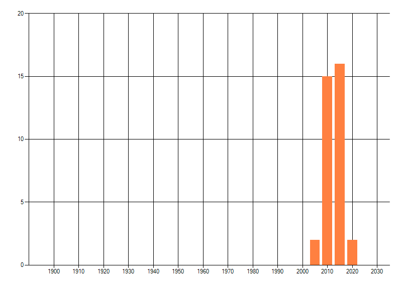 Het aantal atlasblokken (5x5 km) waarin de soort is gemeld binnen een periode van vijf jaar (vanaf 1980) of twintig jaar. Niet gecorrigeerd voor waarnemersinspanning en het aantal doorgegeven waarnemingen kan sterk variëren per periode, dus een trend in verspreiding kan hier niet direct uit worden afgelezen. Het opgegeven jaartal is het eerste jaar van de periode. Bron: gevalideerde waarnemingen uit de NDFF.