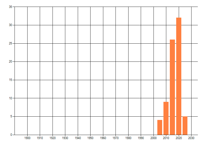 Het aantal atlasblokken (5x5 km) waarin de soort is gemeld binnen een periode van vijf jaar (vanaf 1980) of twintig jaar. Niet gecorrigeerd voor waarnemersinspanning en het aantal doorgegeven waarnemingen kan sterk variëren per periode, dus een trend in verspreiding kan hier niet direct uit worden afgelezen. Het opgegeven jaartal is het eerste jaar van de periode. Bron: gevalideerde waarnemingen uit de NDFF.