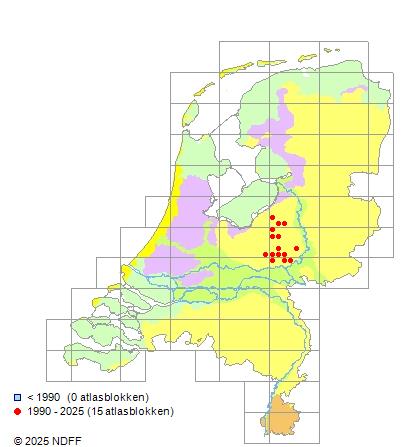 Het aantal atlasblokken (5x5 km) waarin de soort is gemeld binnen een periode van vijf jaar (vanaf 1980) of twintig jaar. Niet gecorrigeerd voor waarnemersinspanning en het aantal doorgegeven waarnemingen kan sterk variëren per periode, dus een trend in verspreiding kan hier niet direct uit worden afgelezen. Het opgegeven jaartal is het eerste jaar van de periode. Bron: gevalideerde waarnemingen uit de NDFF.