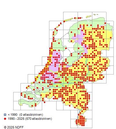 Het aantal atlasblokken (5x5 km) waarin de soort is gemeld binnen een periode van vijf jaar (vanaf 1980) of twintig jaar. Niet gecorrigeerd voor waarnemersinspanning en het aantal doorgegeven waarnemingen kan sterk variëren per periode, dus een trend in verspreiding kan hier niet direct uit worden afgelezen. Het opgegeven jaartal is het eerste jaar van de periode. Bron: gevalideerde waarnemingen uit de NDFF.