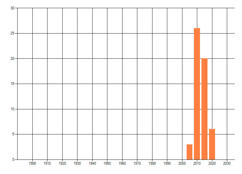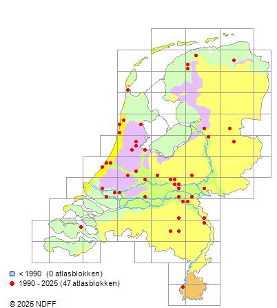 Het aantal atlasblokken (5x5 km) waarin de soort is gemeld binnen een periode van vijf jaar (vanaf 1980) of twintig jaar. Niet gecorrigeerd voor waarnemersinspanning en het aantal doorgegeven waarnemingen kan sterk variëren per periode, dus een trend in verspreiding kan hier niet direct uit worden afgelezen. Het opgegeven jaartal is het eerste jaar van de periode. Bron: gevalideerde waarnemingen uit de NDFF.