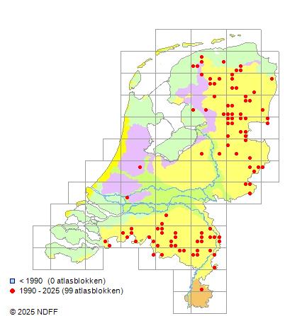 Het aantal atlasblokken (5x5 km) waarin de soort is gemeld binnen een periode van vijf jaar (vanaf 1980) of twintig jaar. Niet gecorrigeerd voor waarnemersinspanning en het aantal doorgegeven waarnemingen kan sterk variëren per periode, dus een trend in verspreiding kan hier niet direct uit worden afgelezen. Het opgegeven jaartal is het eerste jaar van de periode. Bron: gevalideerde waarnemingen uit de NDFF.