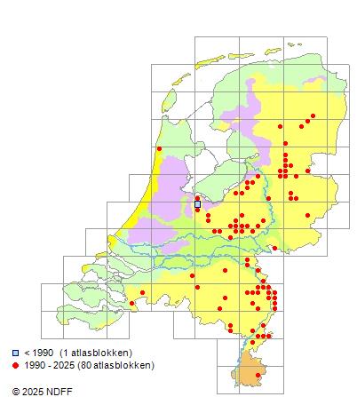 Het aantal atlasblokken (5x5 km) waarin de soort is gemeld binnen een periode van vijf jaar (vanaf 1980) of twintig jaar. Niet gecorrigeerd voor waarnemersinspanning en het aantal doorgegeven waarnemingen kan sterk variëren per periode, dus een trend in verspreiding kan hier niet direct uit worden afgelezen. Het opgegeven jaartal is het eerste jaar van de periode. Bron: gevalideerde waarnemingen uit de NDFF.