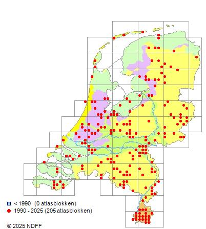 Het aantal atlasblokken (5x5 km) waarin de soort is gemeld binnen een periode van vijf jaar (vanaf 1980) of twintig jaar. Niet gecorrigeerd voor waarnemersinspanning en het aantal doorgegeven waarnemingen kan sterk variëren per periode, dus een trend in verspreiding kan hier niet direct uit worden afgelezen. Het opgegeven jaartal is het eerste jaar van de periode. Bron: gevalideerde waarnemingen uit de NDFF.