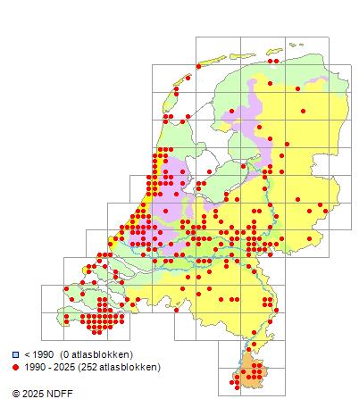 Het aantal atlasblokken (5x5 km) waarin de soort is gemeld binnen een periode van vijf jaar (vanaf 1980) of twintig jaar. Niet gecorrigeerd voor waarnemersinspanning en het aantal doorgegeven waarnemingen kan sterk variëren per periode, dus een trend in verspreiding kan hier niet direct uit worden afgelezen. Het opgegeven jaartal is het eerste jaar van de periode. Bron: gevalideerde waarnemingen uit de NDFF.
